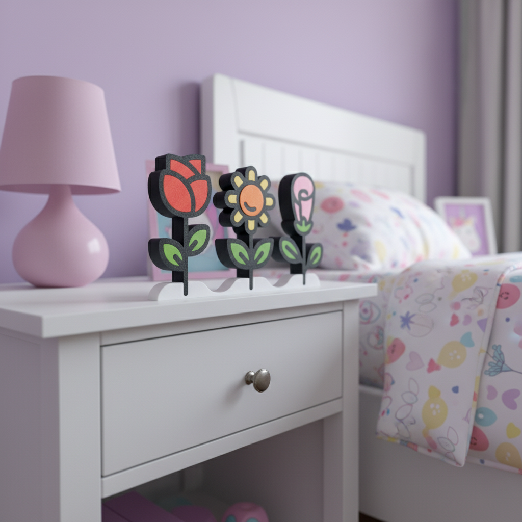 Capture the vibrancy of nature with our 3D-printed sculpture featuring a rose, sunflower, and tulip. Bold colors pop against sleek black edges, creating a stunning, modern accent piece. Perfect for adding a touch of natural beauty to any space.
