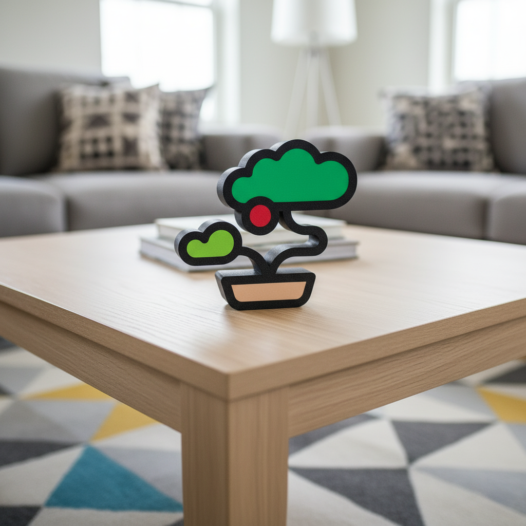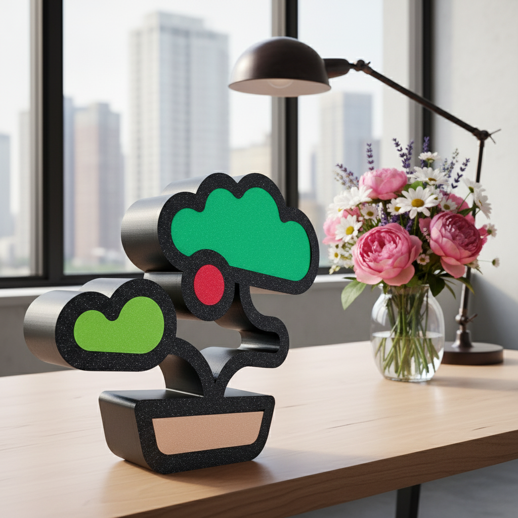 Sumérgete en la tranquilidad y belleza de la naturaleza con esta encantadora escultura de bonsái en miniatura, diseñada por el talentoso artista digital Carlos Battistelli. Con un acabado impreso en 3D y un diseño minimalista, esta pieza captura la esencia de un árbol en perfecta armonía. Sus dos ramas, en tonos de verde sutilmente diferentes, aportan un toque de variación de color que simboliza la diversidad de la vida misma. Enclavado entre las hojas, destaca un pequeño fruto rojo, que aporta una chispa de vitalidad que evoca esperanza, crecimiento y el ciclo eterno de la naturaleza.