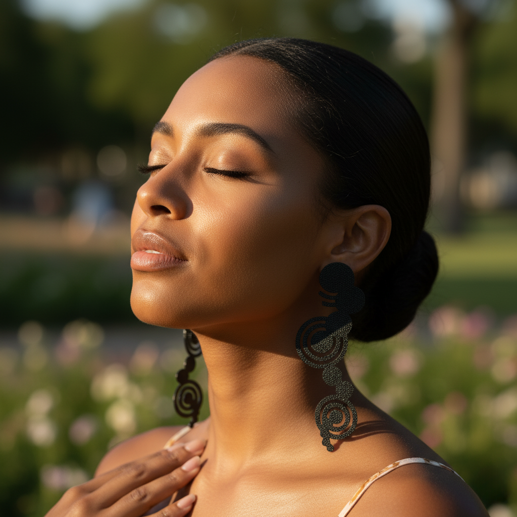 Disponibles en dos variaciones de color, negro intenso y blanco jaspeado, estos pendientes resaltan los detalles geométricos del diseño, evocando la esencia mística de los círculos de las cosechas. La opción negra agrega un toque de sofisticación y profundidad a cualquier atuendo, mientras que el blanco jaspeado aporta un estilo artístico y moderno.