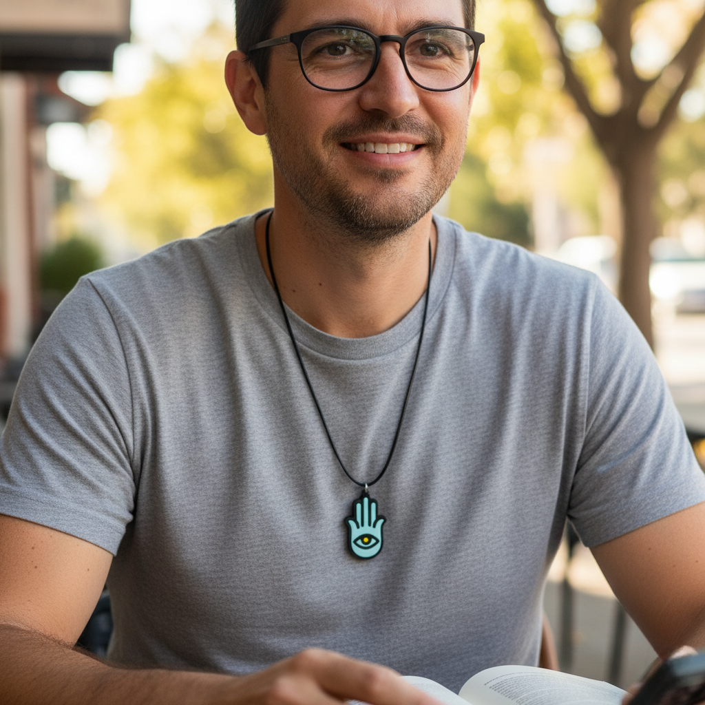 Realza tu estilo con este exclusivo colgante de mano de Fátima. Con un diseño minimalista, este amuleto de la buena suerte aporta energía positiva y aleja la negatividad. Viene con un cordón ajustable para un ajuste cómodo.