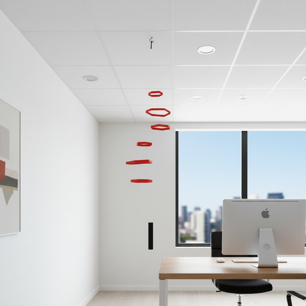 Con seis anillos en forma de hexágono diseñados meticulosamente, el “Hex Mobile” ejemplifica la unión perfecta entre arte y simplicidad. Su estructura, que mide aproximadamente nueve pulgadas de ancho y 43 pulgadas de alto, crea una presencia visual impresionante sin abrumar el entorno.