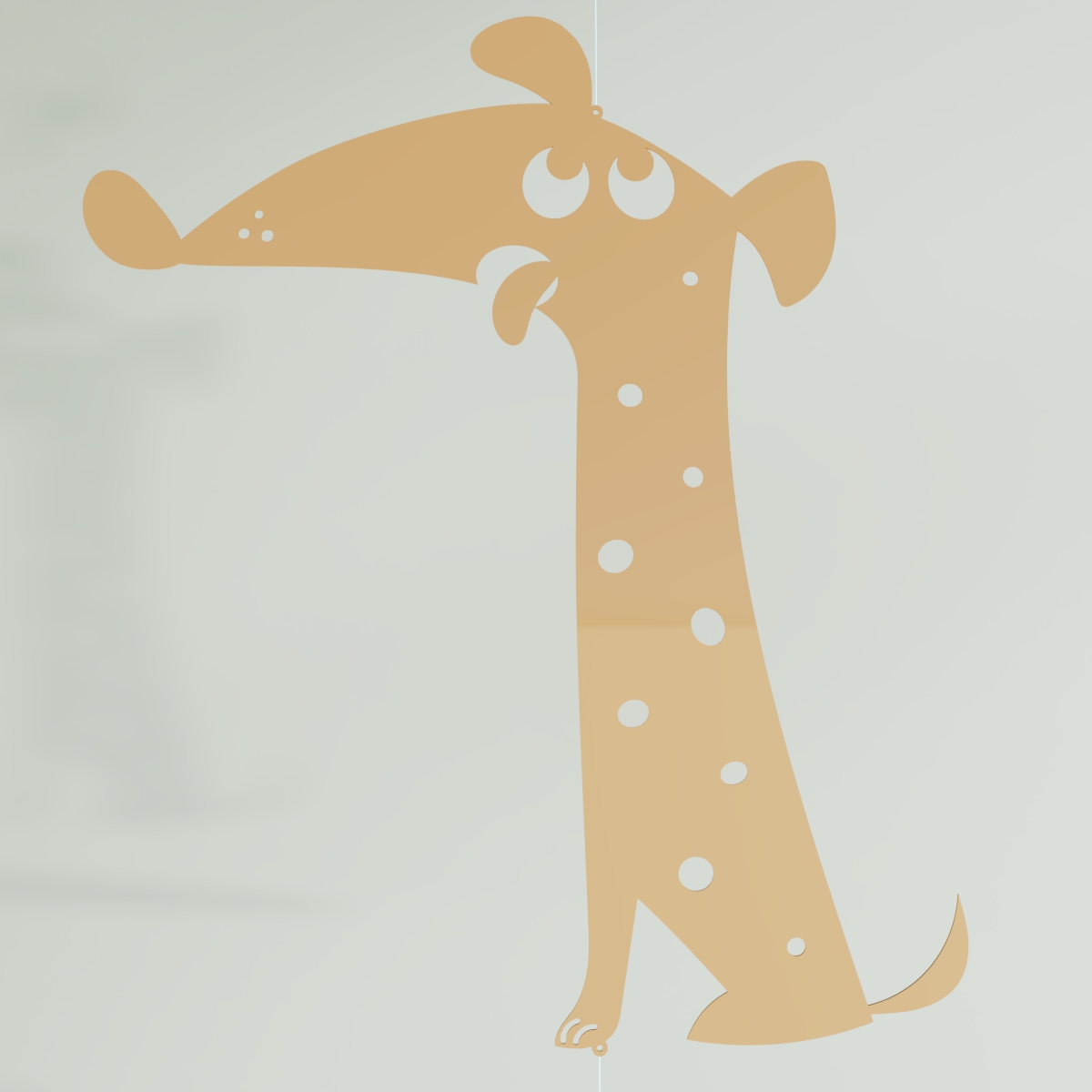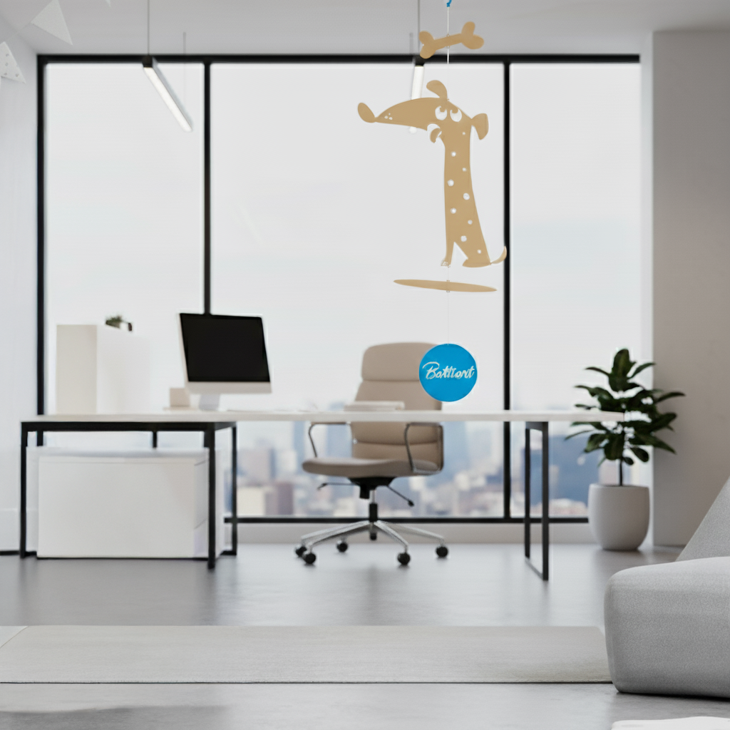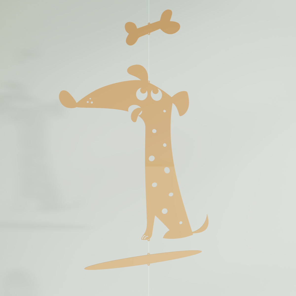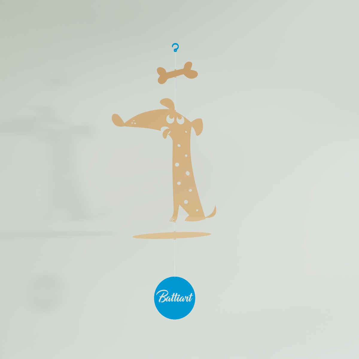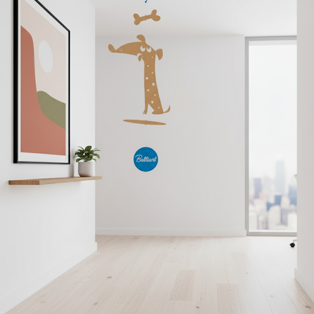 El perrito colgante se encuentra sentadito, con sus ojos fijos en el tentador huesito suspendido sobre él. Su postura es de expectativa, con las orejas alerta y la cola quieta. Su mirada determinada revela su deseo de alcanzar el sabroso premio. Mientras el móvil se balancea suavemente, el perrito espera pacientemente el momento perfecto para hacer su movimiento. ¡Con perseverancia, está determinado a conseguir ese delicioso huesito!