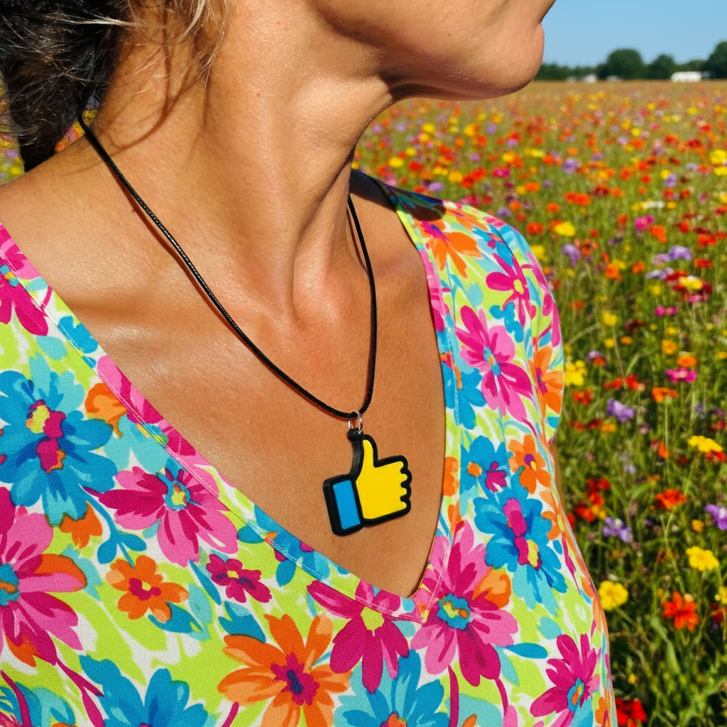 Celebre el símbolo universal de la aprobación con nuestro divertido colgante de mano “Like”. Con una alegre mano amarilla y marrón claro con un pulgar hacia arriba azul, este colgante captura el gesto icónico reconocido en todo el mundo. Es un accesorio divertido y vibrante que agrega un toque de personalidad y positividad a cualquier atuendo. Ya sea que sea un fanático de la cultura de las redes sociales o simplemente ame las joyas únicas, este colgante es una pieza de declaración perfecta. Ideal para regalar o como un regalo personal, está diseñado para traer una sonrisa y una sensación de diversión a su colección de joyas. Abrace la alegría del ícono “Like” con este encantador colgante.