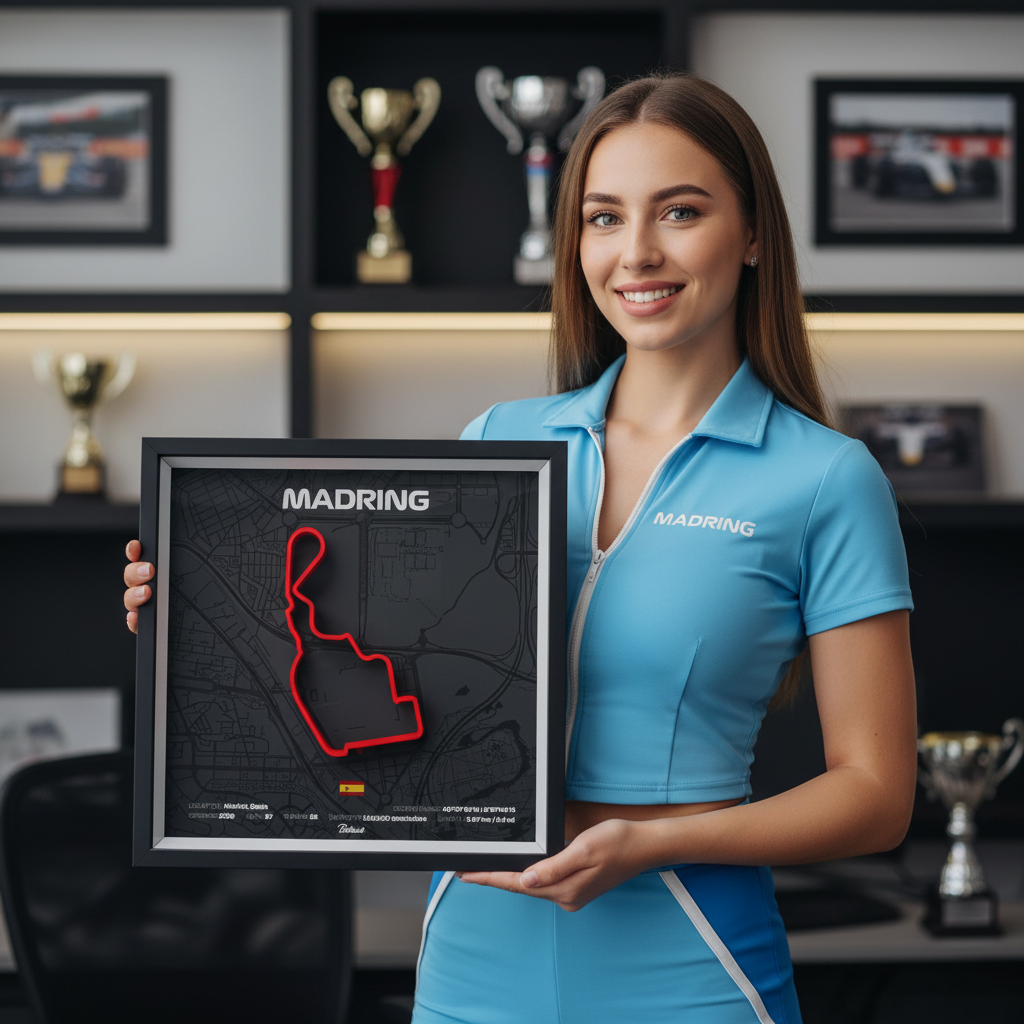 At the heart of the piece lies the vivid red circuit, 3D‑printed using biodegradable plastic and raised nearly 150 mm from the background, producing an impressive three‑dimensional effect with rich shadows and depth. The map beneath it — printed on premium semi‑matte photographic paper — delivers exceptional clarity and lasting color, resistant to time and sunlight. A front transparent biodegradable plastic sheet protects the artwork from dust, scratches, and fingerprints, keeping its elegance intact for years. A small red triangle discreetly marks the starting line and direction of travel, a nod to the precision and authenticity of racing culture.