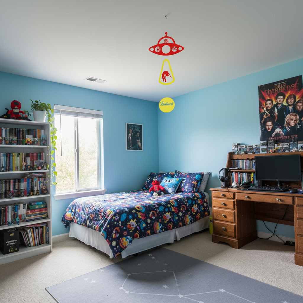 Déjate sorprender por nuestro hanging mobile “OVNI”. Un simpático platillo volador suspendido en el aire mientras “abduce” a una vaca. Este móvil único y divertido añade un toque de humor y originalidad a tu espacio. Cada detalle está cuidadosamente diseñado y fabricado con materiales de calidad. Disfruta de una pieza que te transportará a un mundo lleno de fantasía y diversión. ¡Déjate llevar por la magia de “OVNI” en tu hogar!