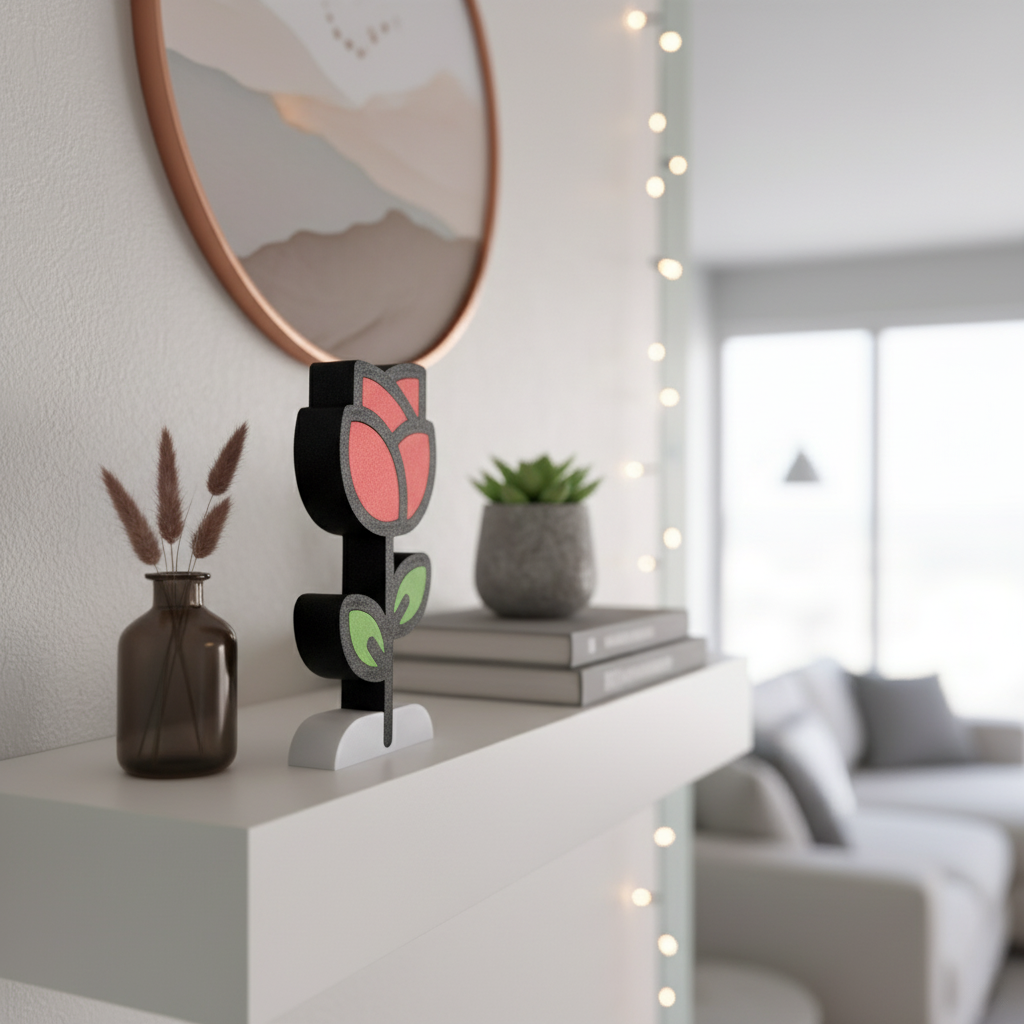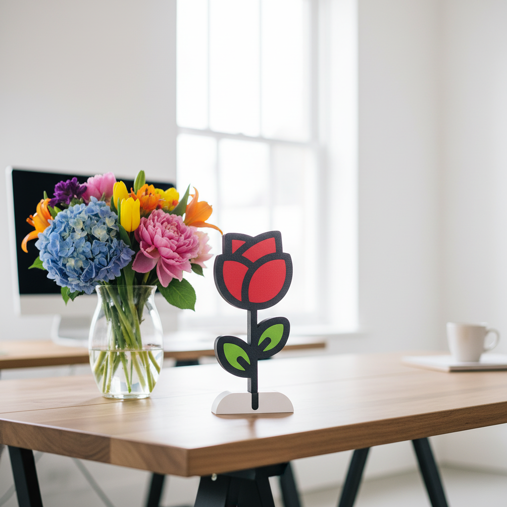 This 3D printed sculpture of a red rose with black edges and green leaves is perfect for expressing love. Ideal for decorating offices or homes, it adds a touch of harmony and affection to any space. Whether as a romantic gift or a decorative piece, this exquisite rose enhances the ambiance with its striking beauty and symbolic elegance.