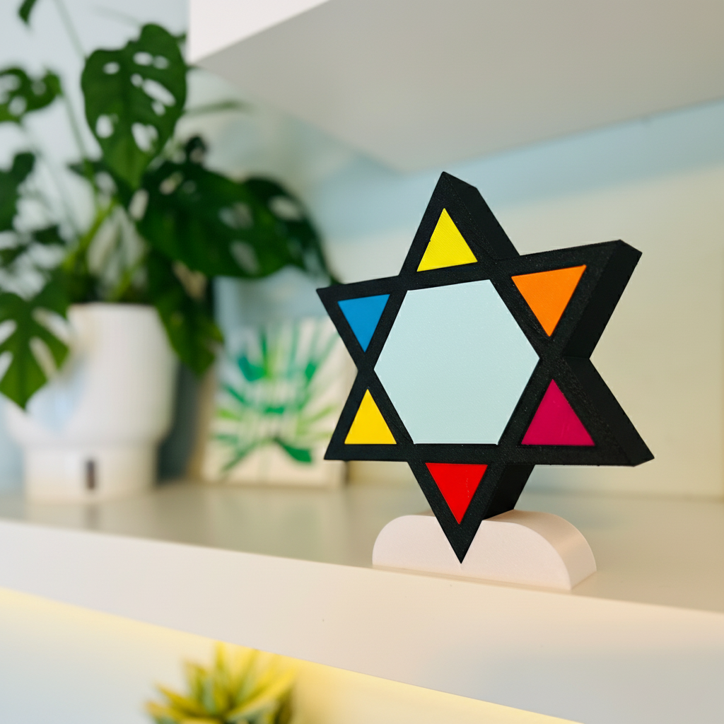 Add a vibrant touch to your decor with our 3D-printed Star of David sculpture. Featuring a multicolor palette of sky blue, red, orange, yellow, and blue with a sleek black edge, this piece exudes optimism, evokes deep emotion, and brings warmth to any home. Its minimalist design doubles as a striking decorative accent.