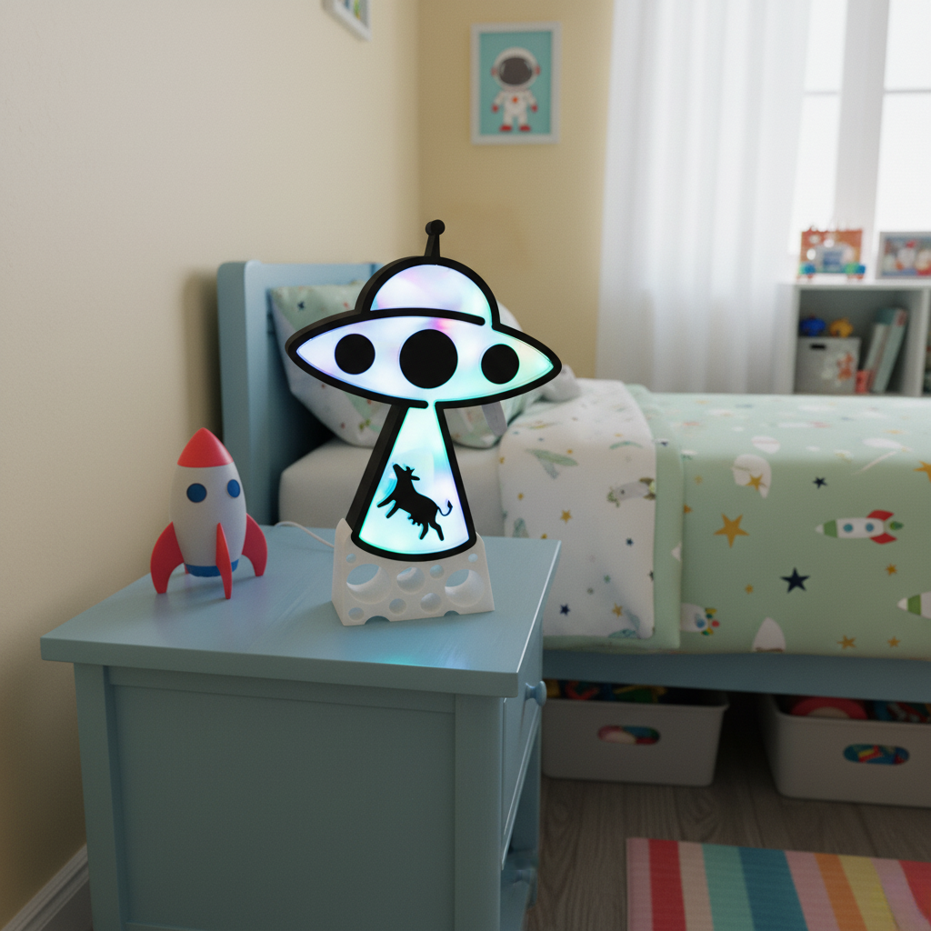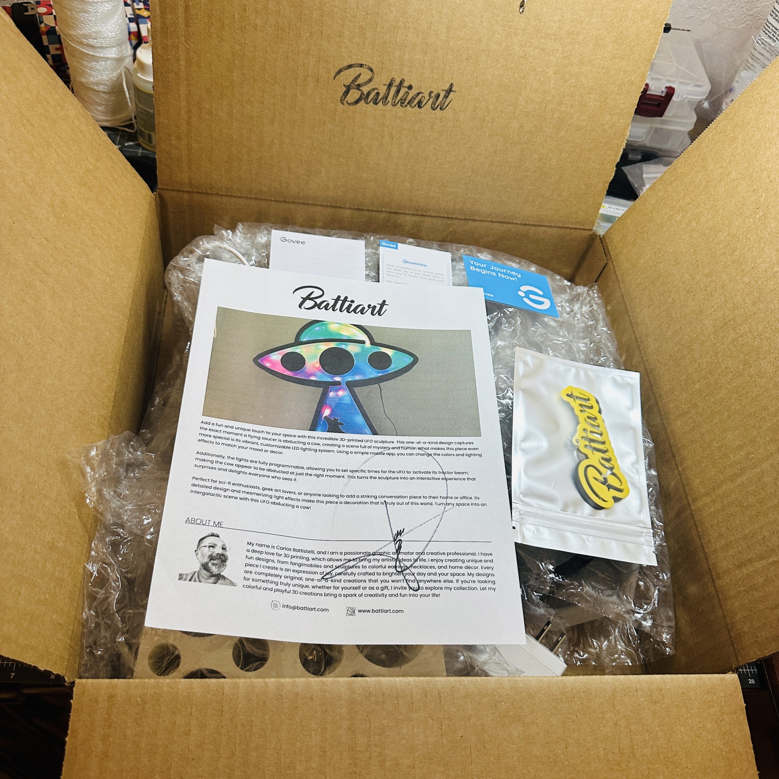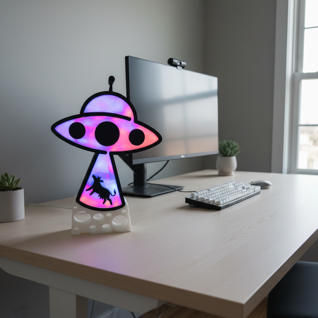 Add a fun and unique touch to your space with this incredible 3D-printed UFO sculpture. This one-of-a-kind design captures the exact moment a flying saucer is abducting a cow, creating a scene full of mystery and humor. What makes this piece even more special is its vibrant, customizable LED lighting system. Using a simple mobile app, you can change the colors and lighting effects to match your mood or decor. Additionally, the lights are fully programmable, allowing you to set specific times for the UFO to ‘activate its tractor beam,’ making the cow appear to be abducted at just the right moment. This turns the sculpture into an interactive experience that surprises and delights everyone who sees it. Perfect for sci-fi enthusiasts, geek art lovers, or anyone looking to add a striking conversation piece to their home or office. Its detailed design and mesmerizing light effects make this piece a decoration that is truly out of this world. Turn any space into an intergalactic scene with this UFO abducting a cow!